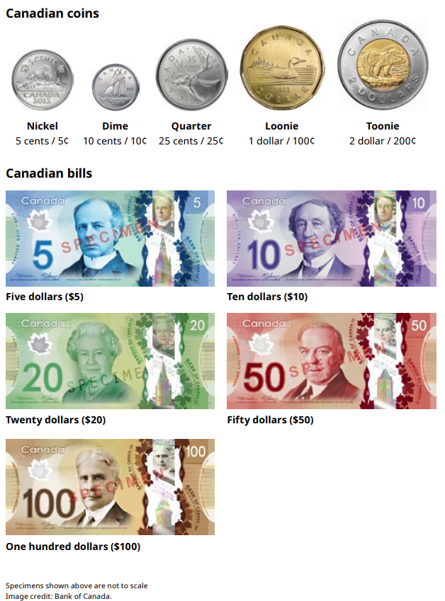 The money used in Canada is the Canadian dollar (money is also called "cash"). Cash is coins and bills.